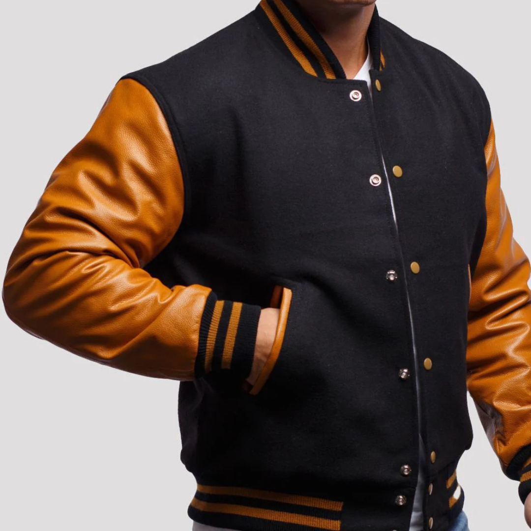 Black Wool Varsity Jacket with Old Gold Leather Sleeves