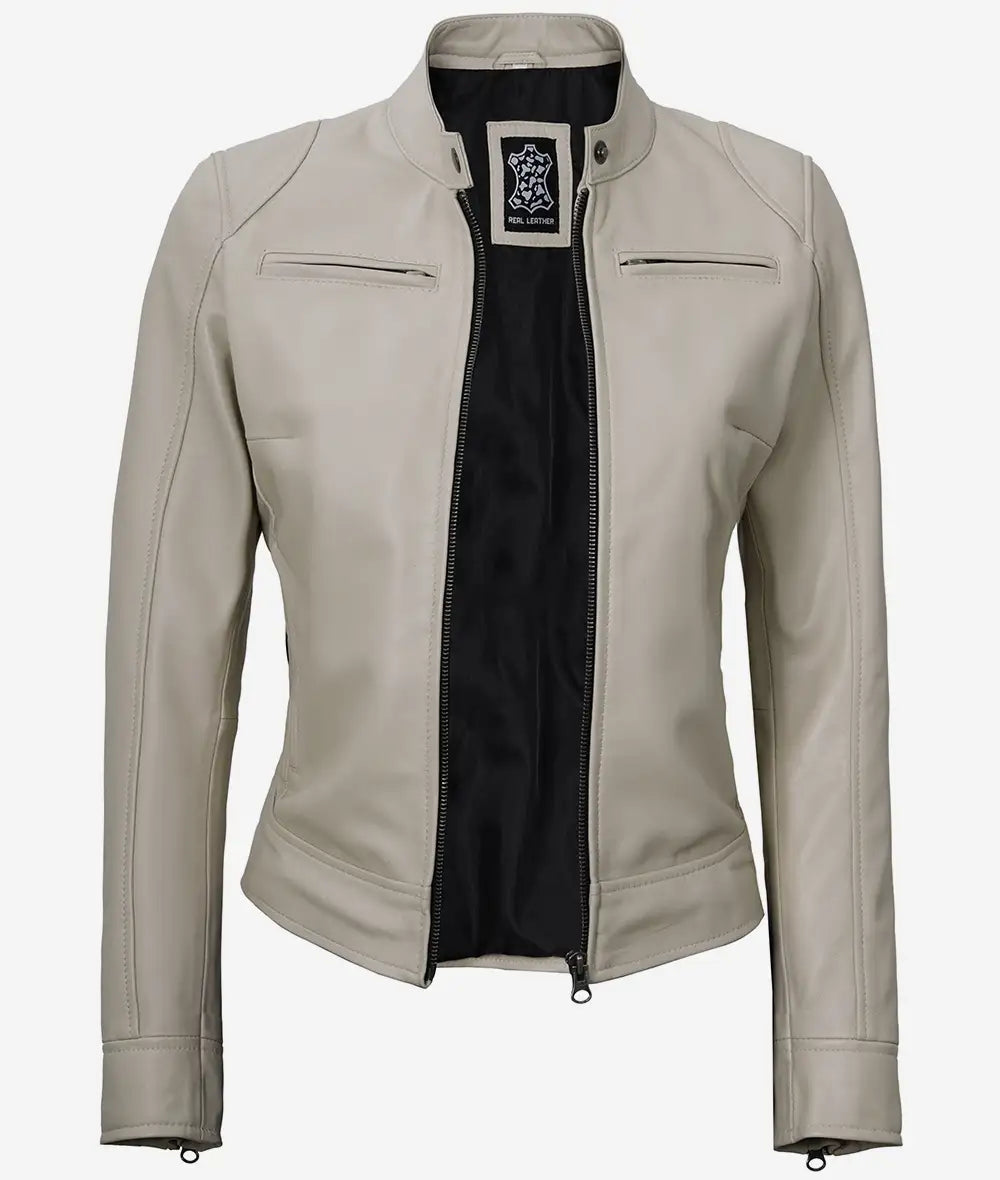 Dodge Women’s Beige Cafe Racer Leather Jacket