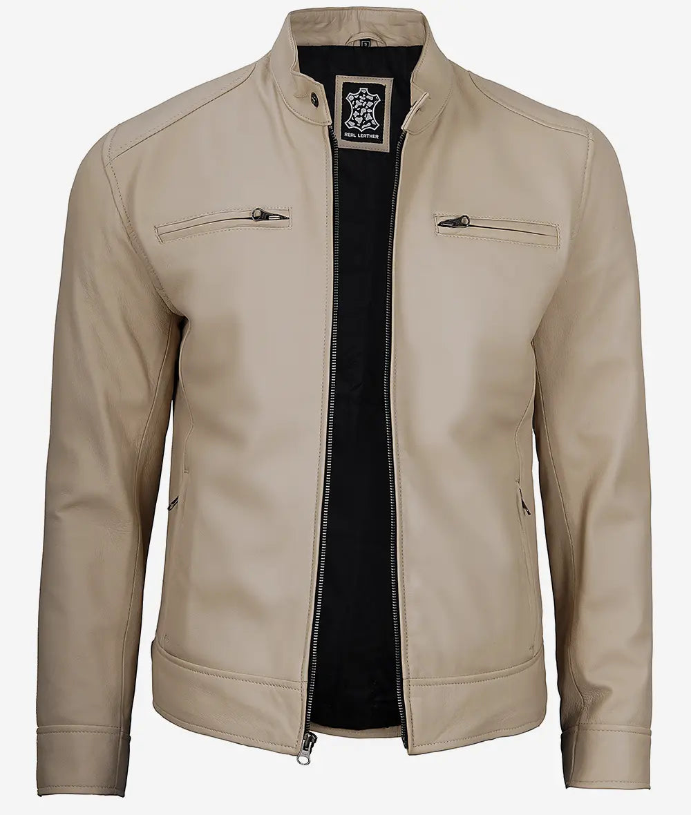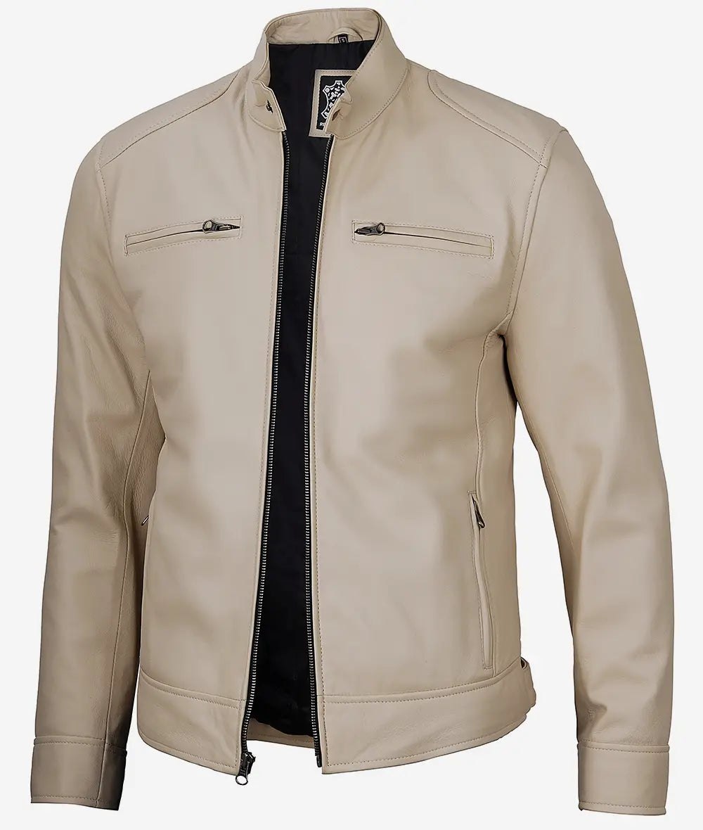 Men’s Beige Cafe Racer Leather Jacket