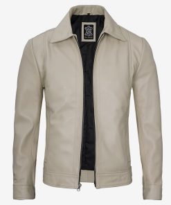 Men’s Beige Classic Shirt Collar Real Leather Jacket