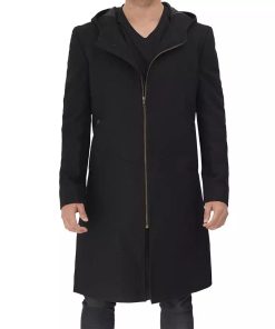 Men’s Black Zip Closure Wool Coat with Hood