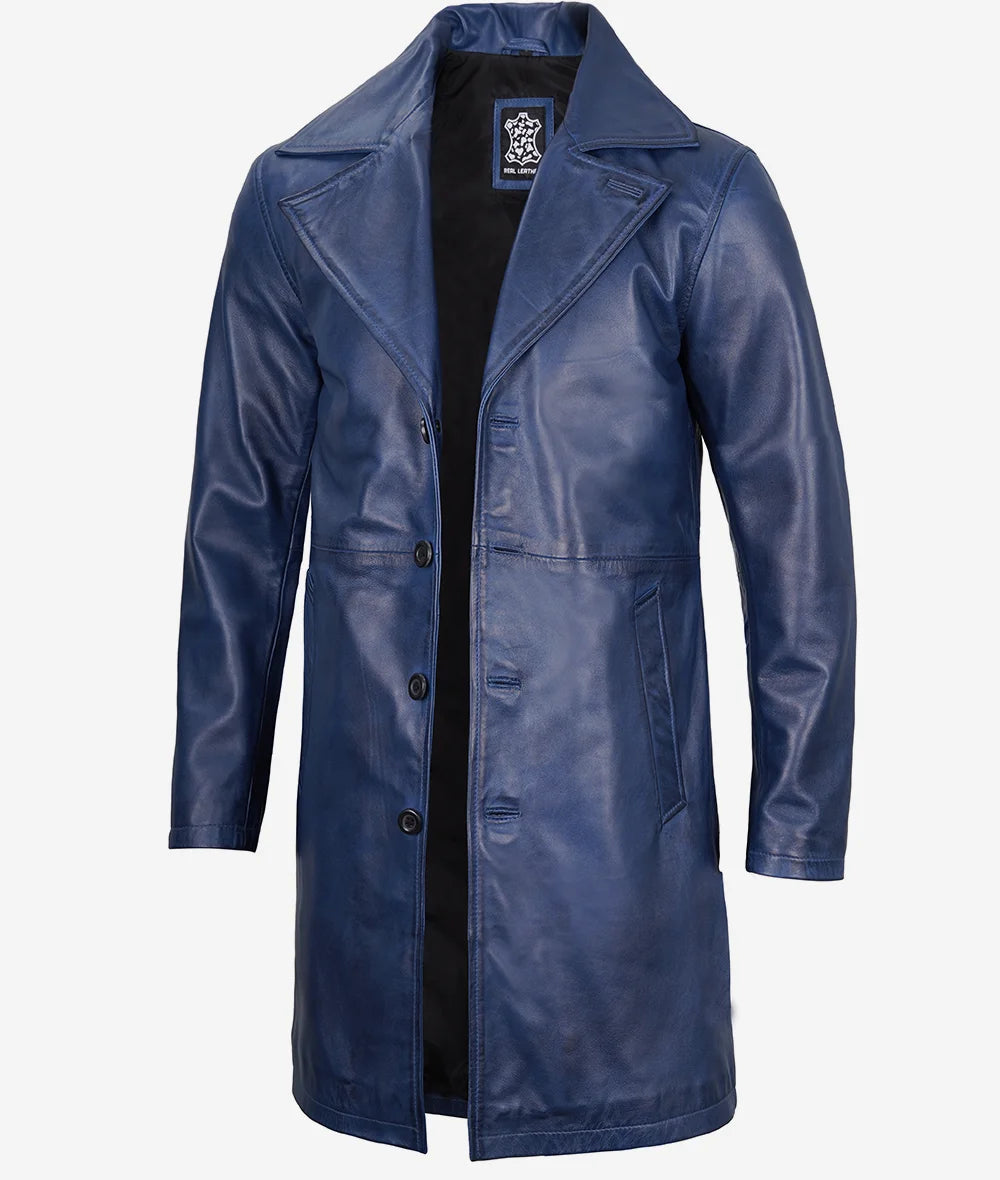 Men’s Blue 3/4 Length Real Leather Car Coat