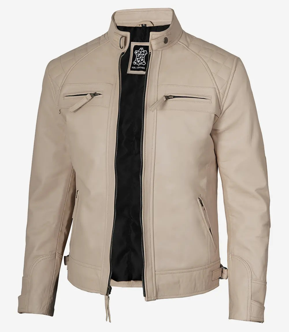 Men’s Cafe Racer Beige Real Leather Jacket – Quilted Shoulder
