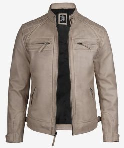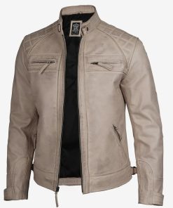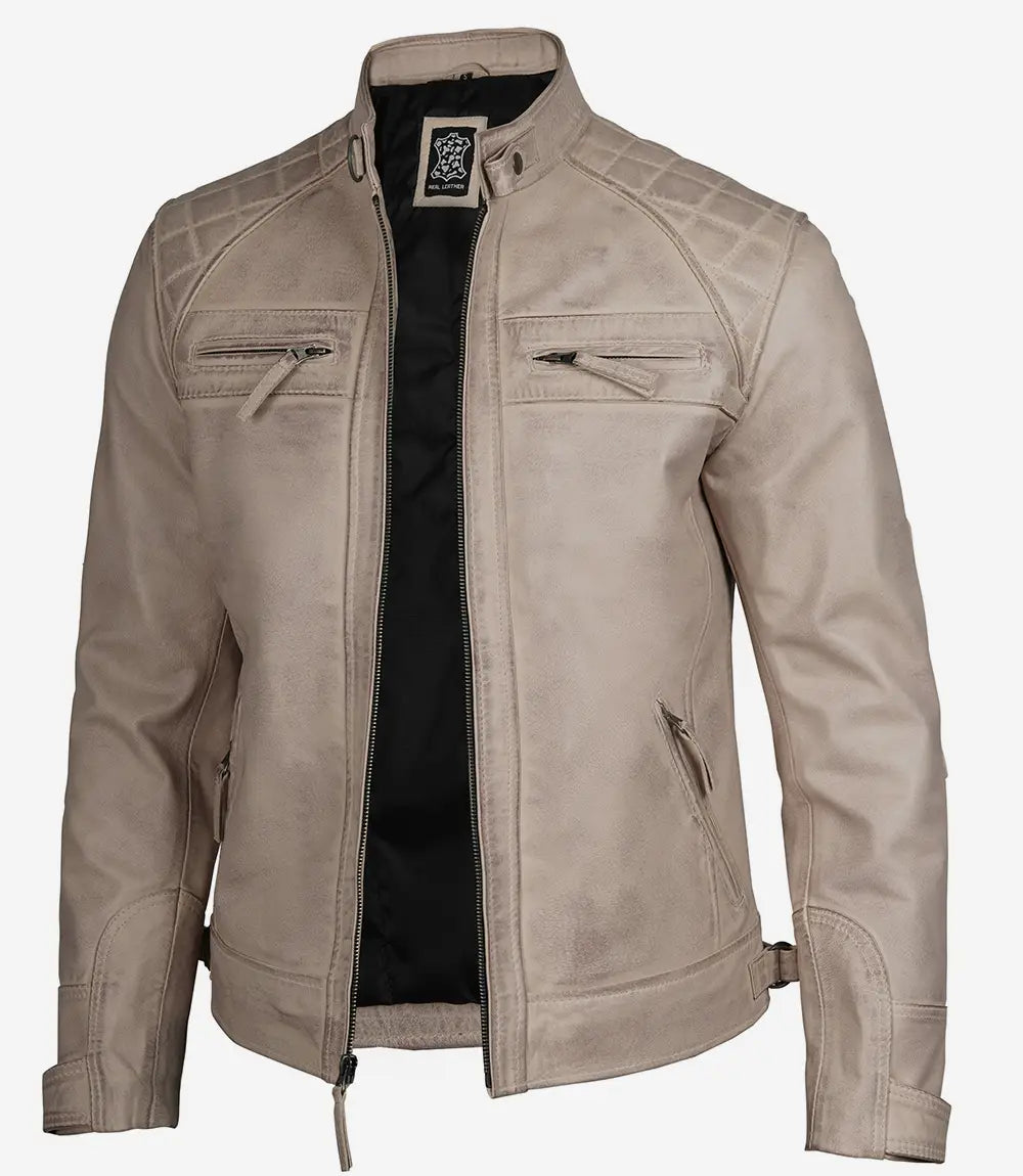 Men’s Cafe Racer Quilted Shoulder Beige Leather Jacket