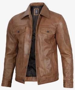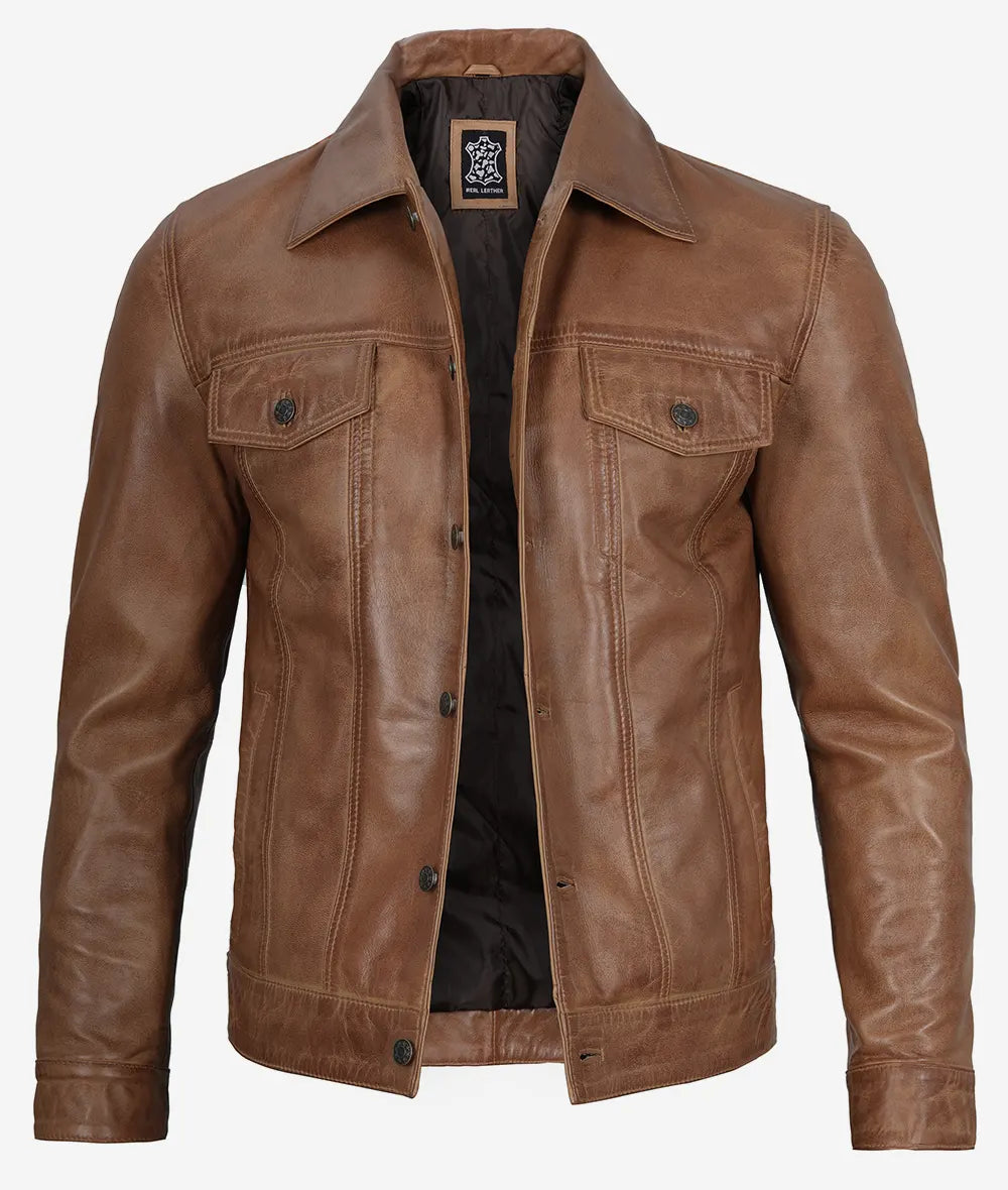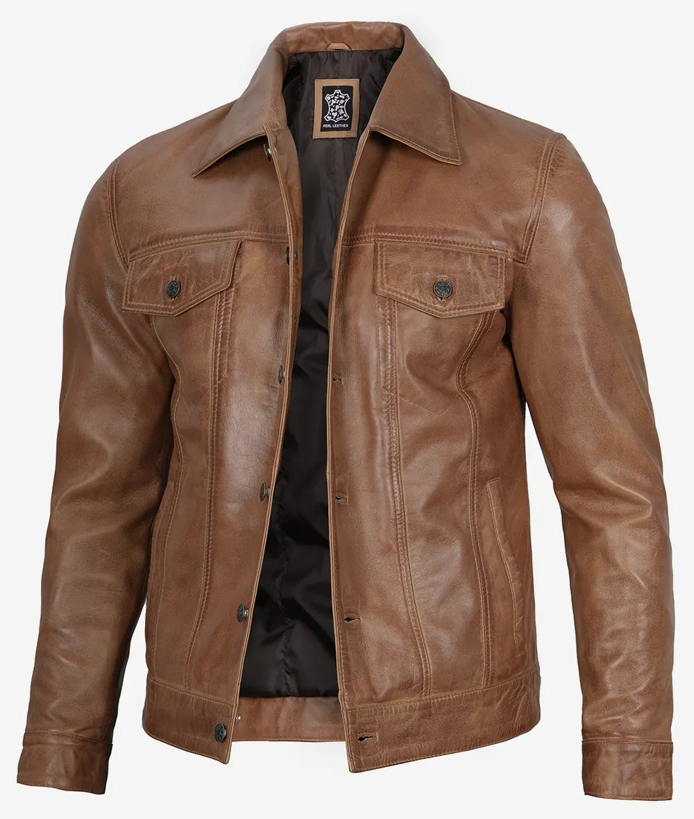Men’s Camel Brown Leather Trucker Jacket