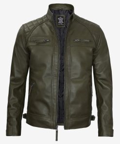 Men’s Military Green Quilted Shoulder Cafe Racer Leather Jacket