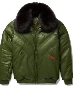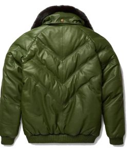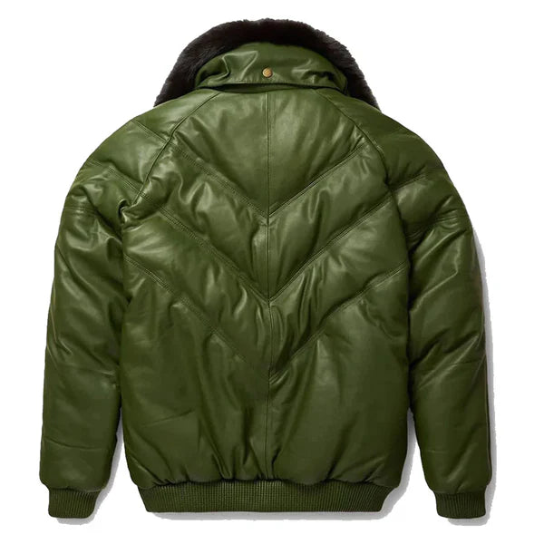 Men’s V-Bomber Faux Shearling Green Leather Jacket