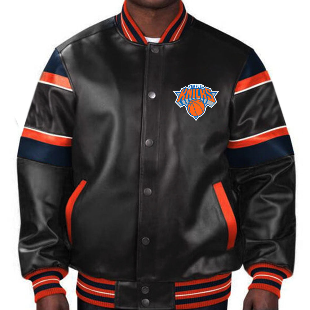 Buy and Gear up in style with the NBA New York Knicks Leather Jacket by TJS. Made from premium leather, this jacket features the iconic Knicks logo and colors. Stay warm and represent your team in a sleek and durable jacket. Perfect for any basketball fan or fashion enthusiast.