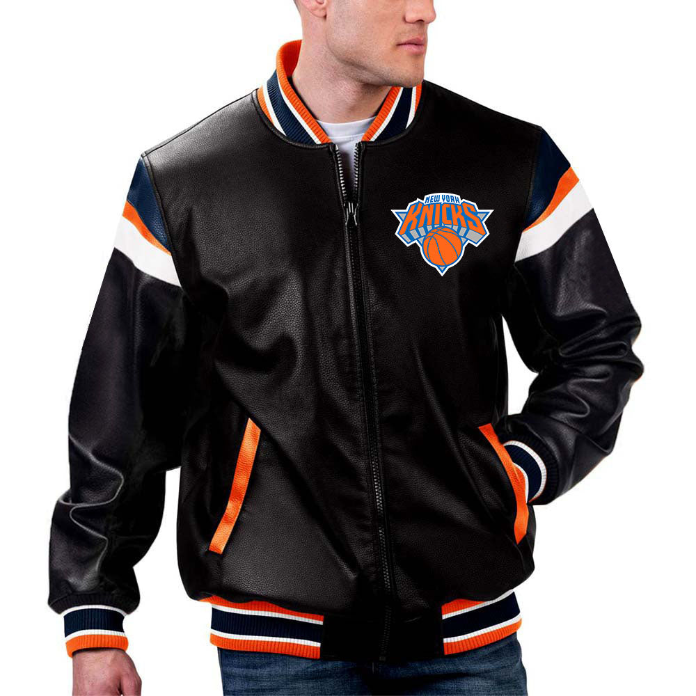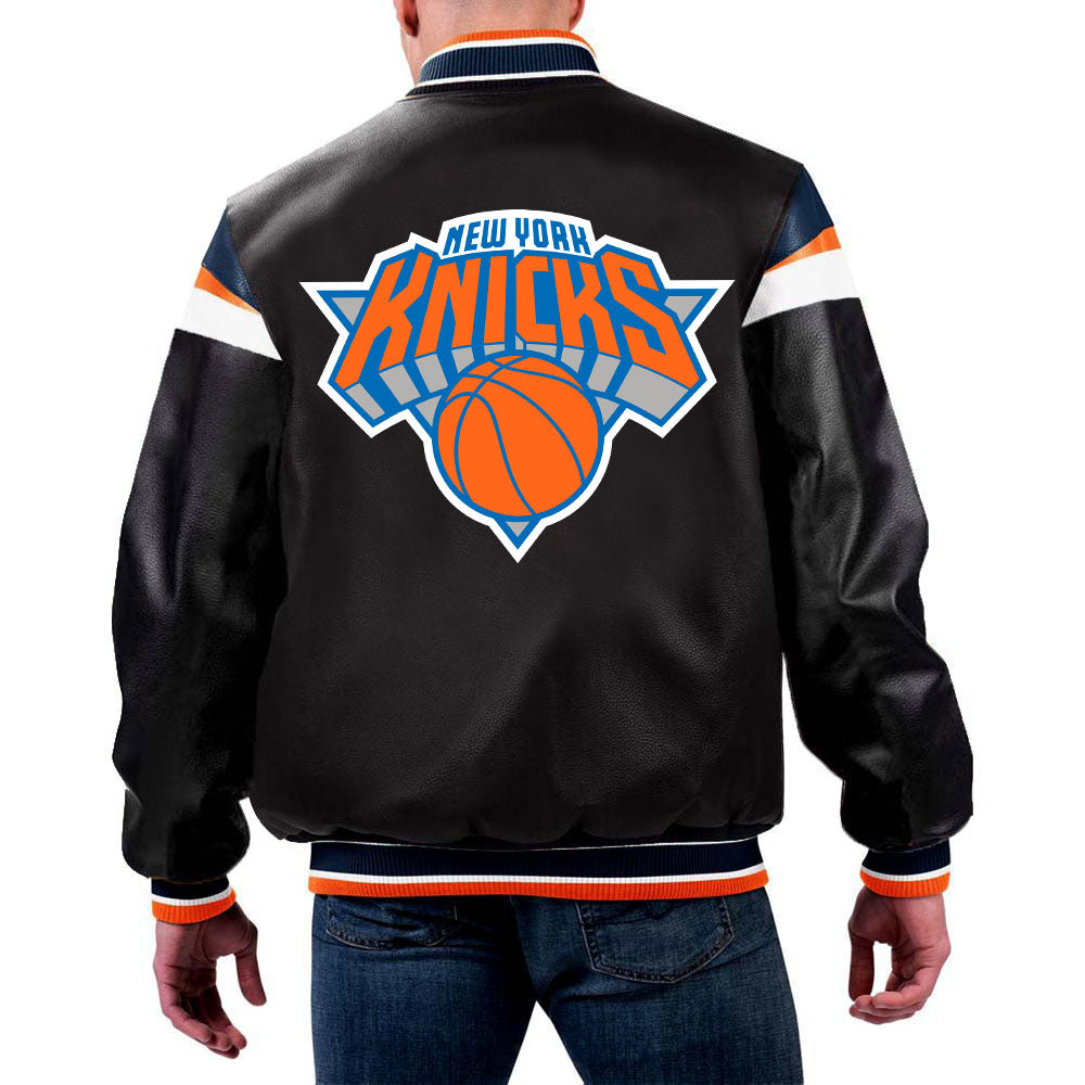 Buy and Gear up in style with the NBA New York Knicks Leather Jacket by TJS. Made from premium leather, this jacket features the iconic Knicks logo and colors. Stay warm and represent your team in a sleek and durable jacket. Perfect for any basketball fan or fashion enthusiast.