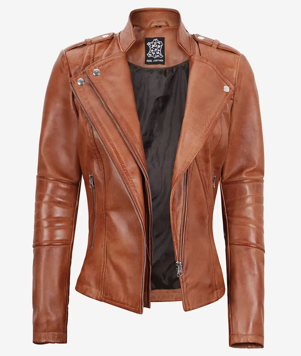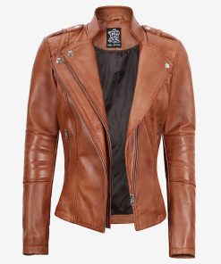 Women’s Asymmetrical Tan Moto Leather Jacket