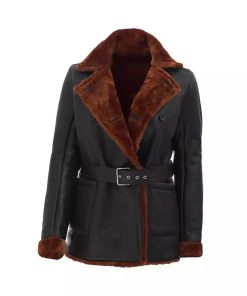 Women’s Black Belted Leather Shearling Coat – Double-Breasted Style