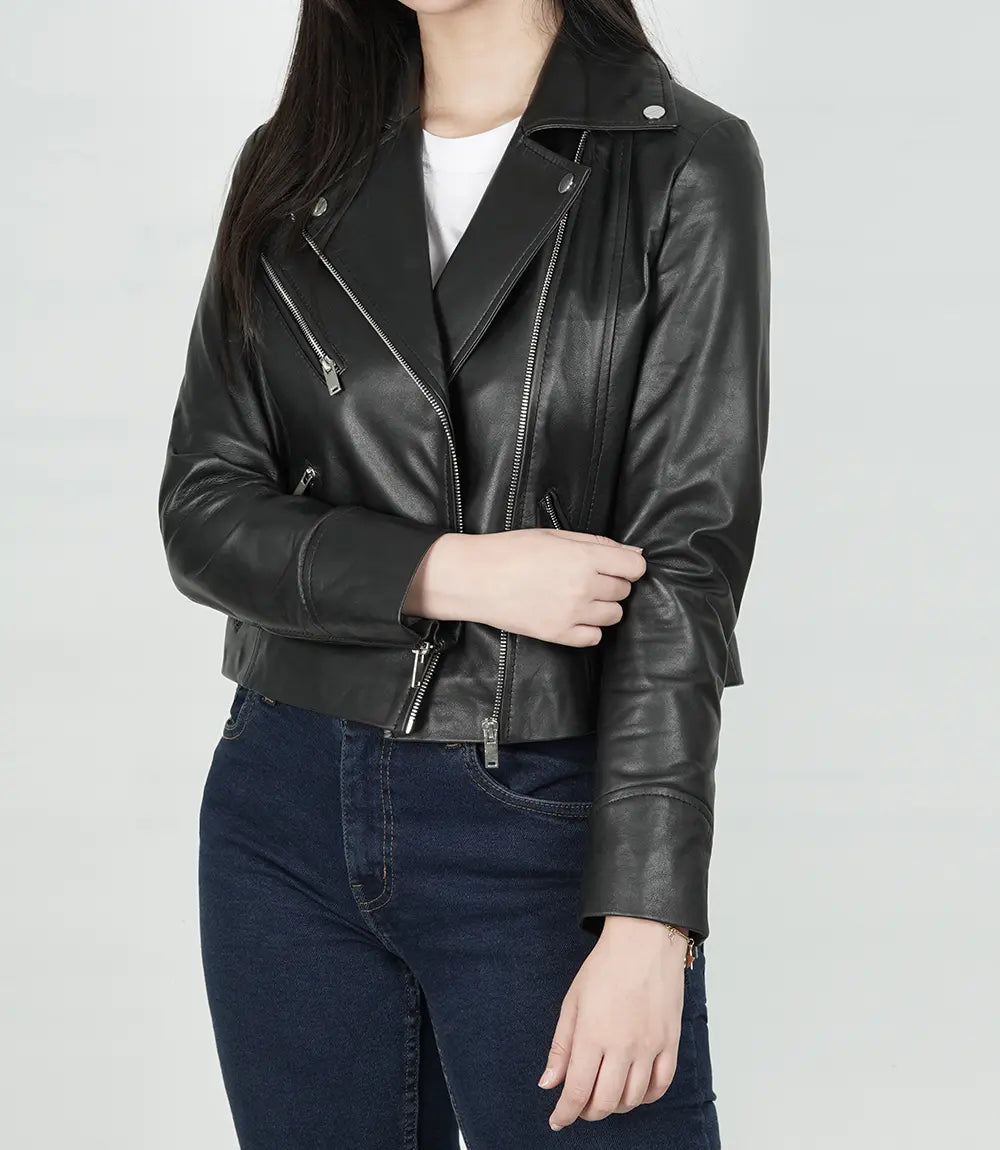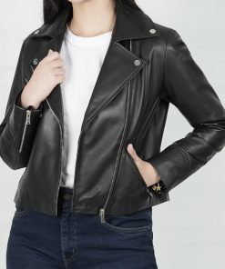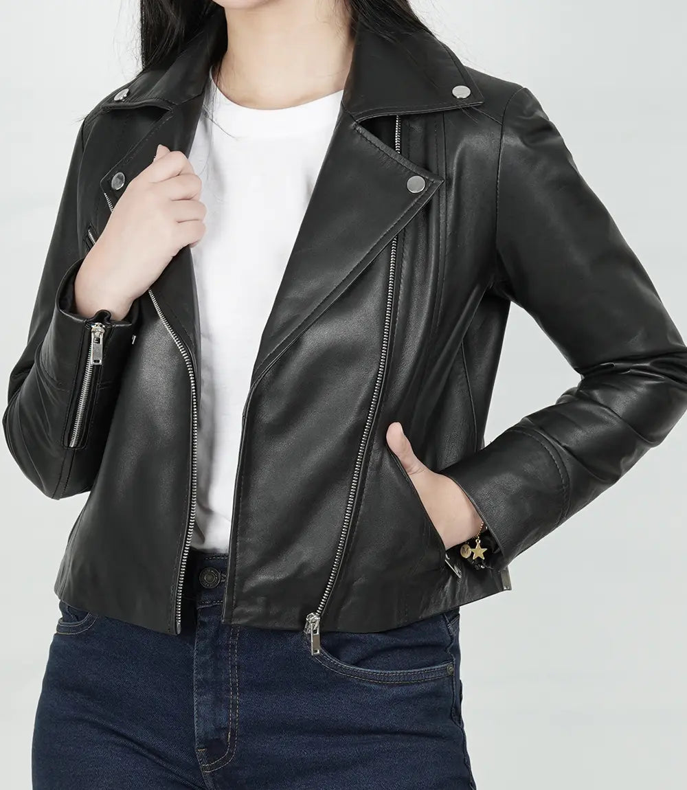Women’s Black Relaxed Fit Real Lambskin Leather Moto Jacket