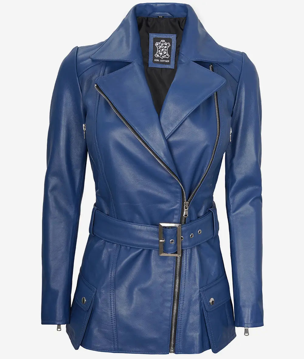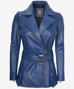 Women’s Blue Asymmetrical Belted Moto Leather Jacket