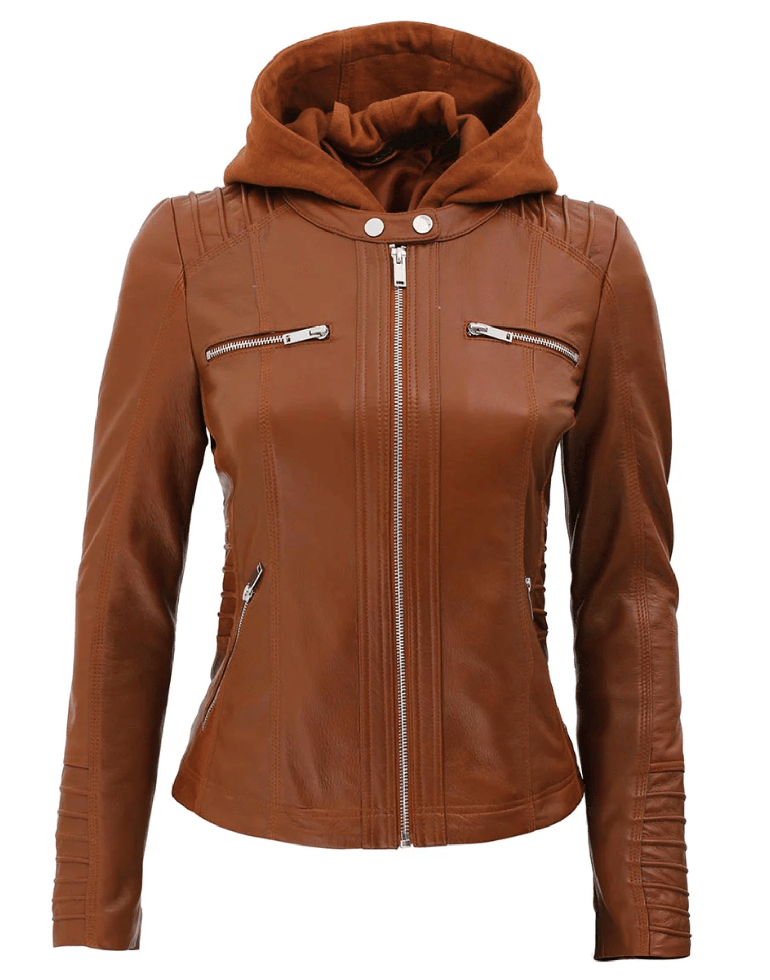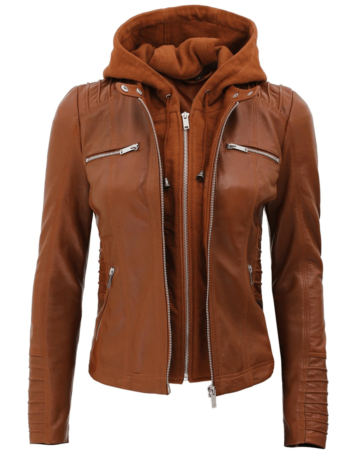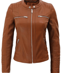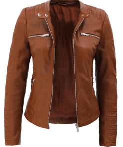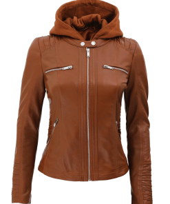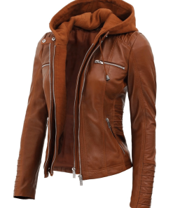 Womens Brown Racer Leather Jacket With Removable Hood