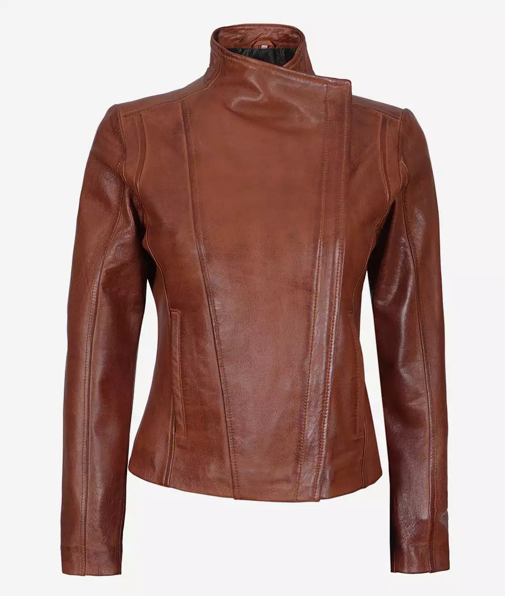 Women’s Cognac Asymmetrical Leather Moto Jacket