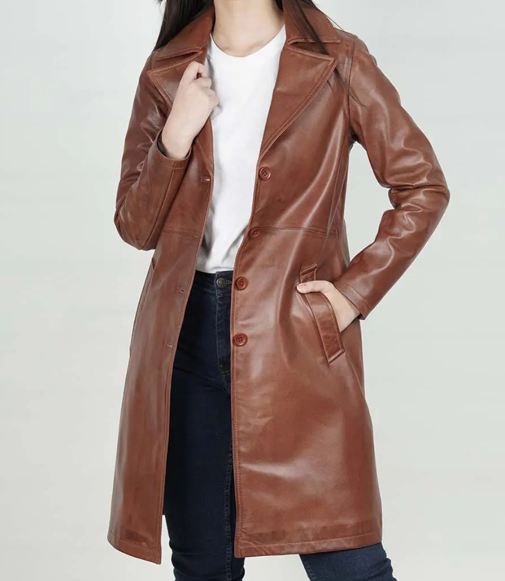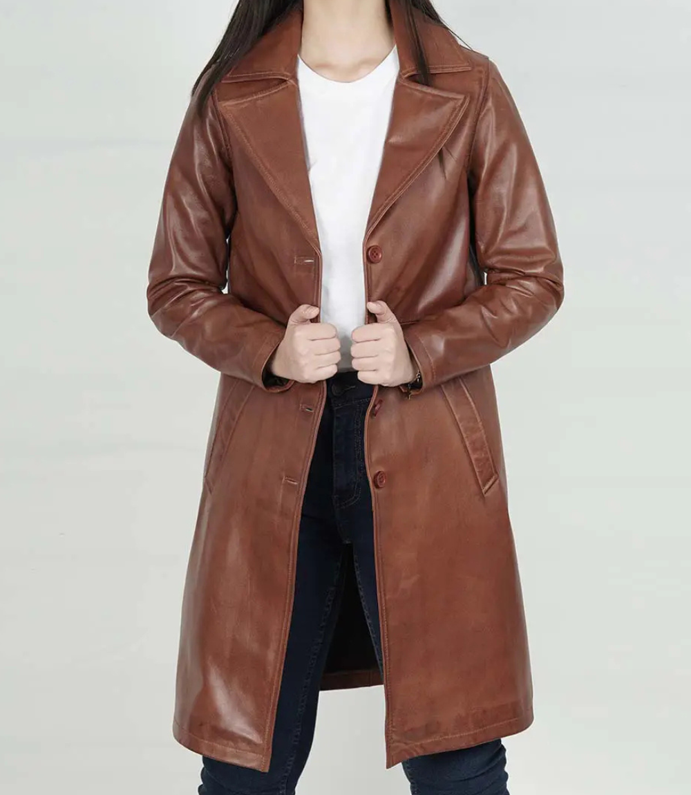 Women’s Cognac Long Leather Car Coat