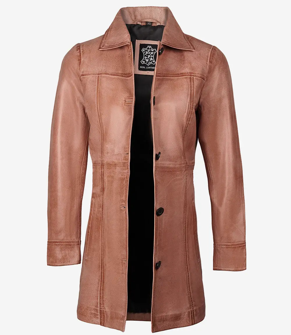 Women’s Pink Cognac Button Down Waxed Leather Coat